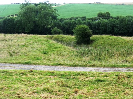 The pasture on your left contains a large moat–like hollow stretching off toward the wood. It is very wide and has been quarried for building clay at several places, giving it an irregular appearance. This hollow might be a couple of things. It could be a sunken medieval road known as a holloway - leading up to the deserted village of Calceby.