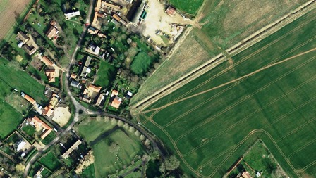 With your eye, follow its line south, across the manor’s drive, across the road and south into the grass field on the other side. Now see if you can find the main street which intersects it, leading off into the village remains in the field to the east. It continues to head south to disappear before the field edge. This could well have been the line of the original right of way.