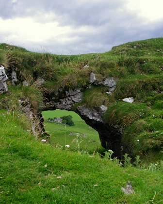 Walk along the minor road a very short way towards the cattle grid and sign which reads, HORSE DRAWN VEHICLES AND ANIMALS. This is the start of the concessionary path to Chrome Hill. Make your way to the top via the well-worn route, then over the summit a short way, to find the rock arch, just to the right of the path.