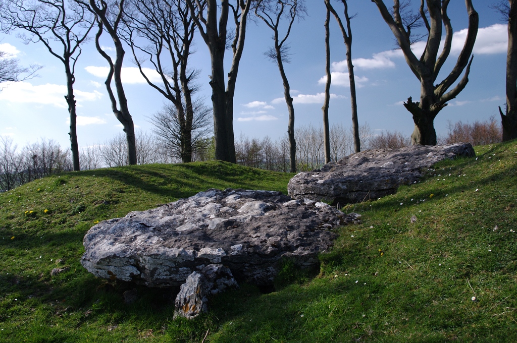 Surrounded by a magical ring of beech trees, the hilltop is littered with strange slabs of pale limestone; they could be teeth extracted from some stone giant. Take a closer look and you will see that they are not like the random blocks we passed on our way up here, but deliberate human constructions.