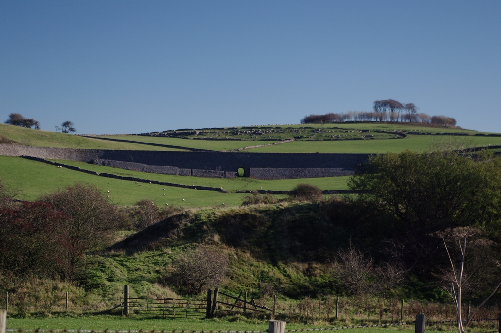 The view back up to Minninglow from here provides a layer-cake scene through the historical use of this landscape. On the hill's summit the prehistoric burial site; below that the natural outcrops of limestone (which provided the slabs for those tombs); then stone walls dating back to the enclosure acts of the late eighteenth century; finally the magnificent railway embankment of 1831.