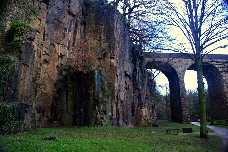 Walk along the pavement towards the New Mills Heritage Centre on the corner (this is a must visit at the end of the trail). Walk down the fifty-one steps to the bottom of the gorge and turn left for the rock face and viaduct arches.