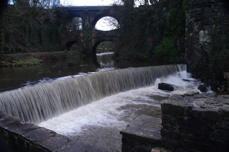 Pass under the viaduct, go past the big weir and then turn right to cross over the River Sett via the wooden bridge. Follow the wide path upstream along the River Goyt, under the tall stone road bridge to arrive at the old weir.