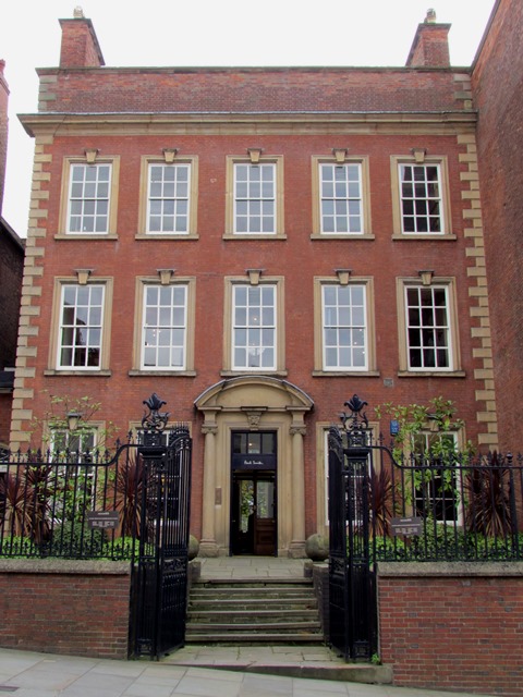 Go straight ahead onto Low Pavement, which rises uphill. Stop on the right hand side just before a pair of red telephone boxes. You should be outside a grand building set back from the road.