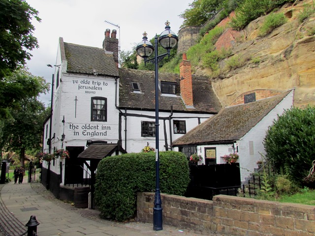 With the Castle Rock behind you turn left, then follow the path to the Museum of Nottingham Life buildings (a group of redbrick cottages with benches outside). Go through the metal gate and stop at the pub on the left, Ye Olde Trip to Jerusalem.