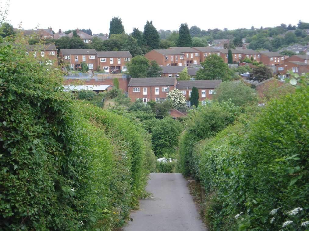 Looking down 10th Avenue and across the far hillside, just to the right of the telecommunications mast you can see the roof and chimneys of an old Victorian redbrick building. Allotments originally spread all the way to this hill but land was sold in the 1870s to build Mapperley Hospital which served as the Borough of Nottingham Lunatic Asylum (and is now apartments).