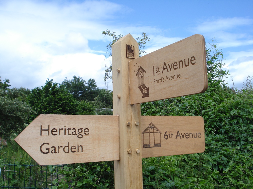 Go through the metal gate signposted Heritage Display Garden and walk along the pathway. After a short distance it bears round to the right. At the end is the gate to Garden 319 which has a sign Oliver’s Heritage Display Garden. Go through the gate into the garden. Walk straight along the path and stop at the information post for the Victorian Garden which is just to the right of the glasshouse.