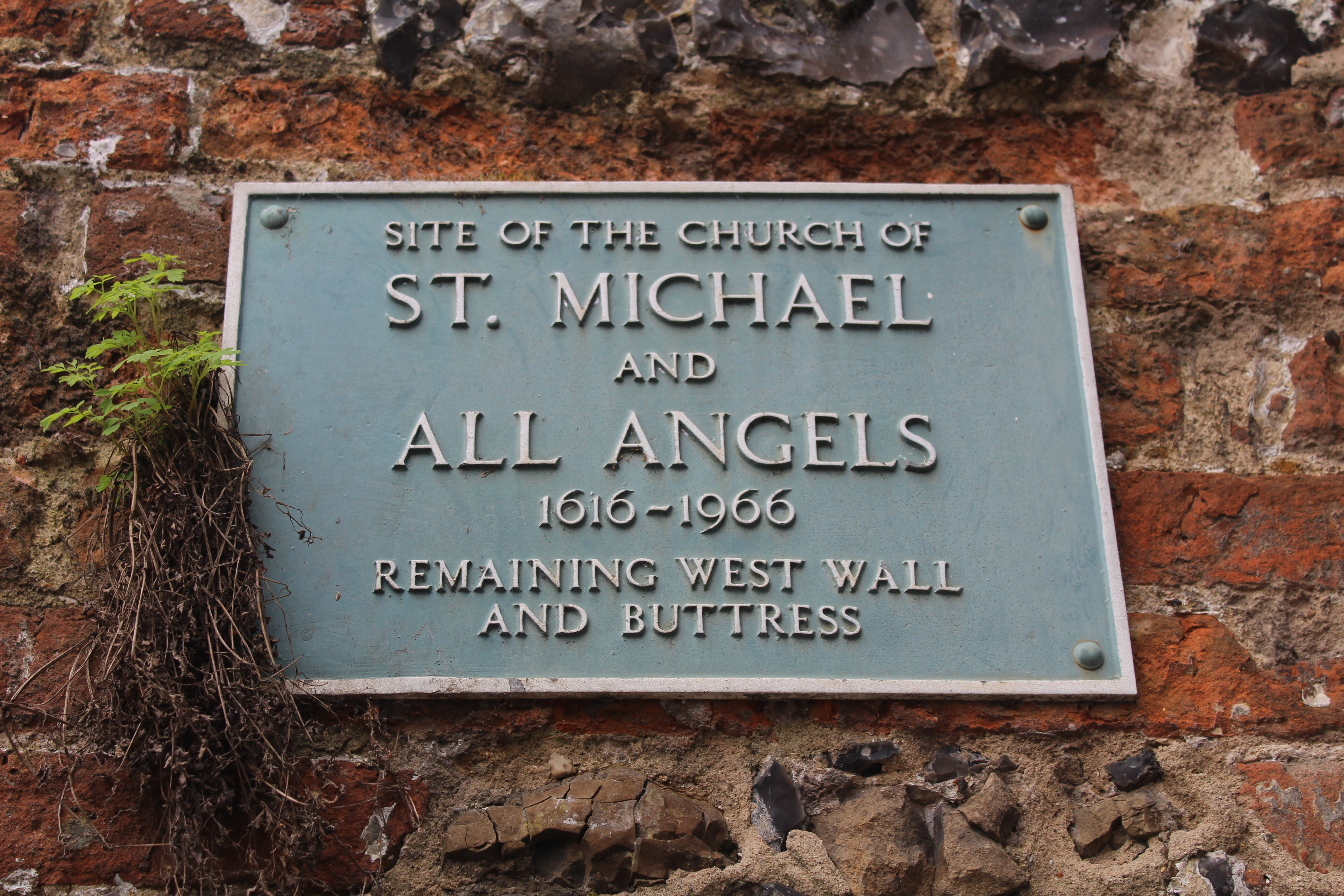 This old brick wall next to the hairdressers would be easy to miss. But look up and you’ll see a plaque fixed to the brickwork: ‘Site of the church of St Michaels and All Angels 1616-1966’.