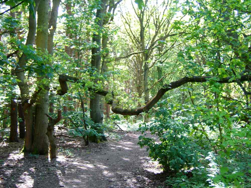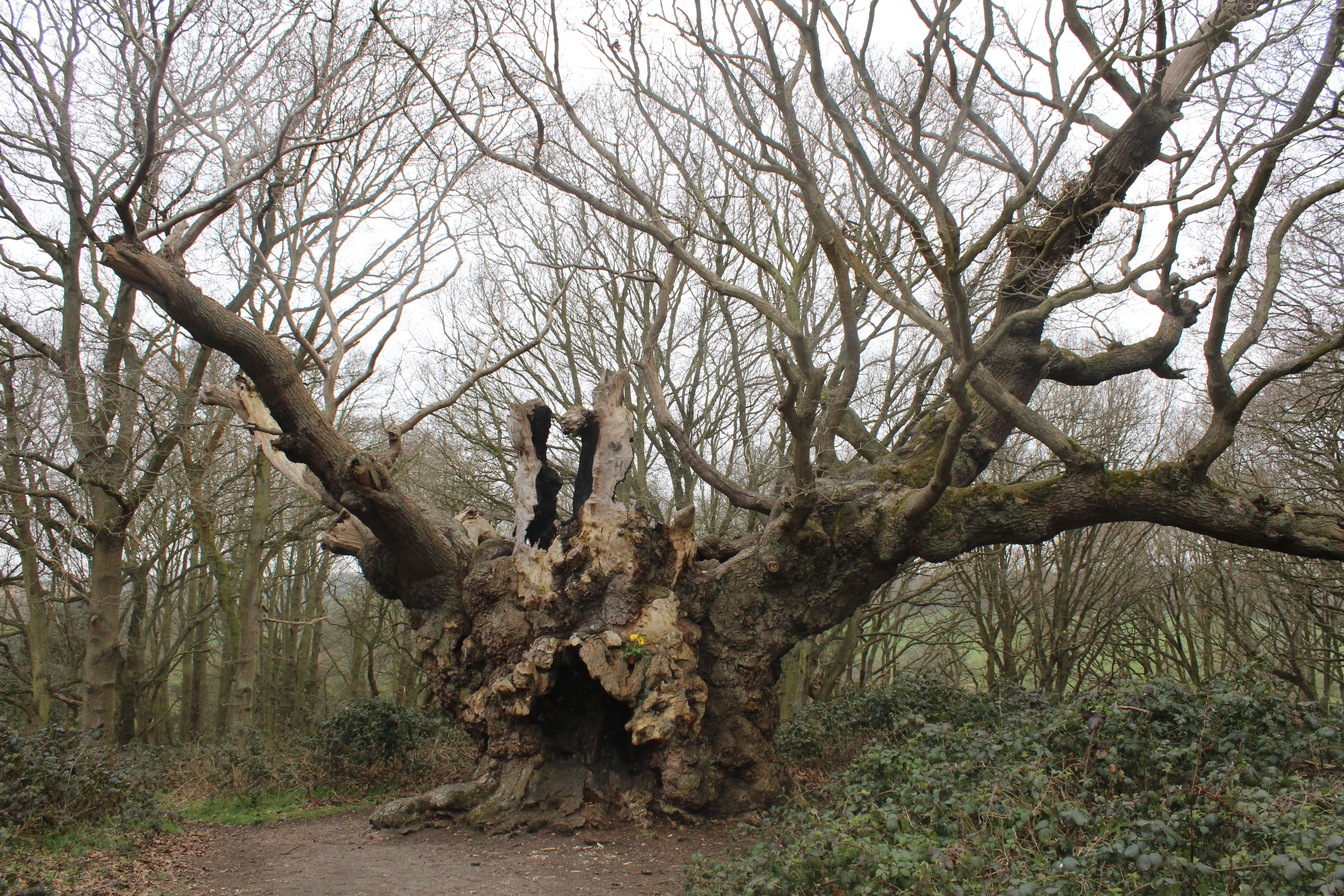 Retrace your steps back to the main path then follow it uphill to reach an ancient oak tree with a half trunk in the woods.