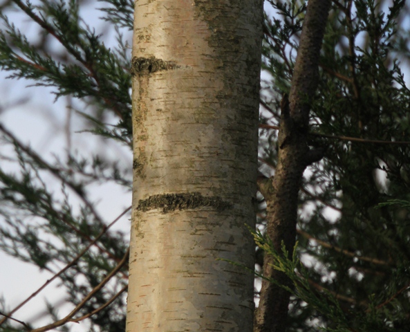 There are very many different varieties of birch trees across the world, and here we can compare two types. The larger of the two trees in this small patch of grass beside the footpath is a Silver Birch. The rough white and grey bark is very distinctive. As the tree ages the roughness becomes more apparent.