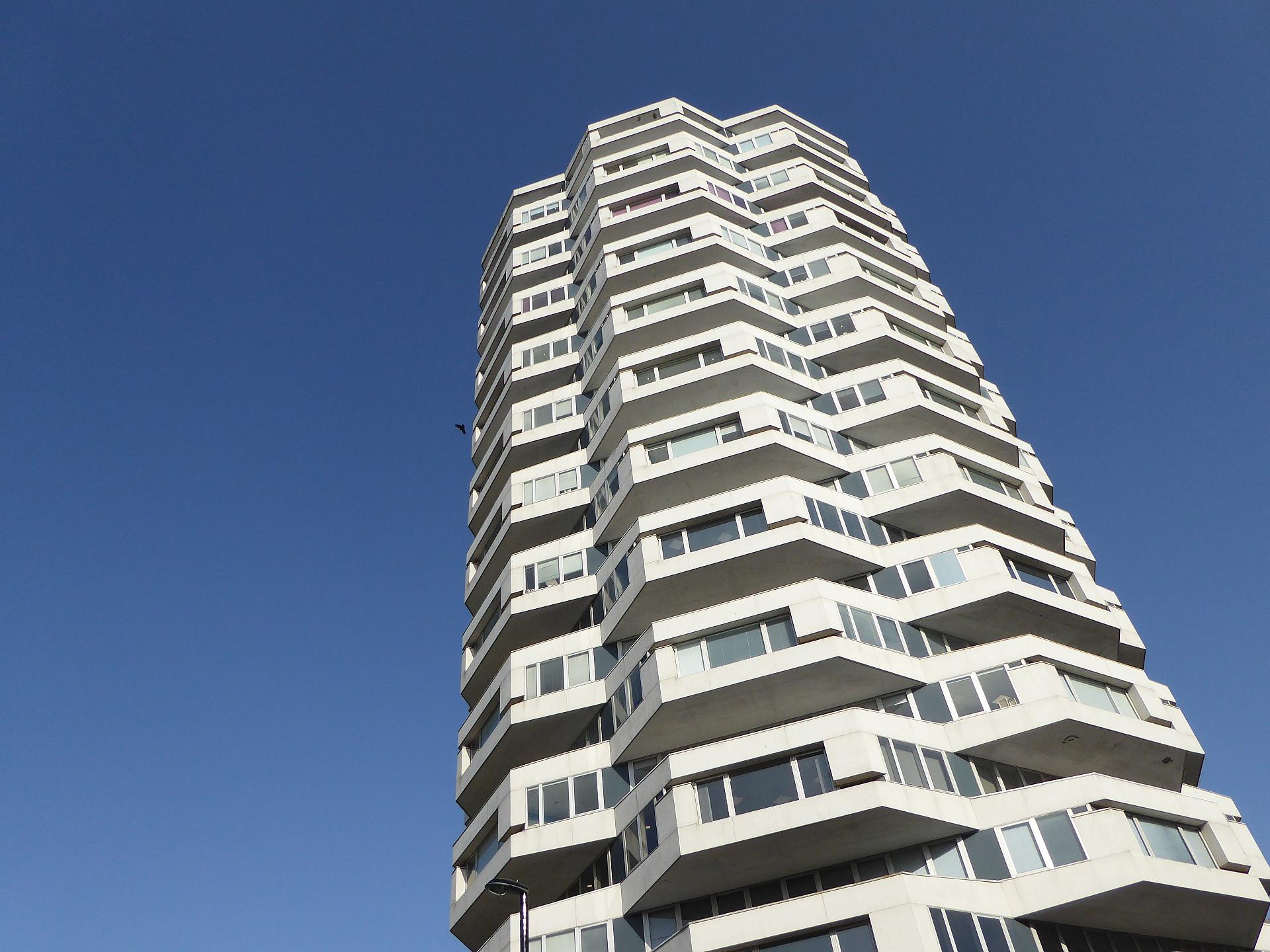 This tower, officially called St George’s House, is commonly known as the Nestlé Building. Until 2012 it was the Swiss company’s UK headquarters. The end wall still carries their familiar logo, with its trio of birds. Their abandoned nest sings a surprising song.