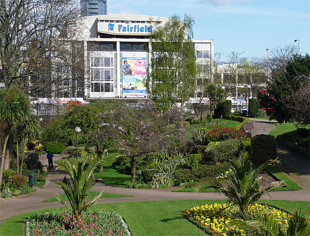 Go into the lower gardens (there are steps or a path to choose from). With the Clock Tower behind you, exit the gardens by going through the short tunnel under the road. You will emerge near the Fairfield Halls and across the road from a tower block with ‘Nestlé’ written on the top end wall. Continue past the bus stops and stop opposite this building.