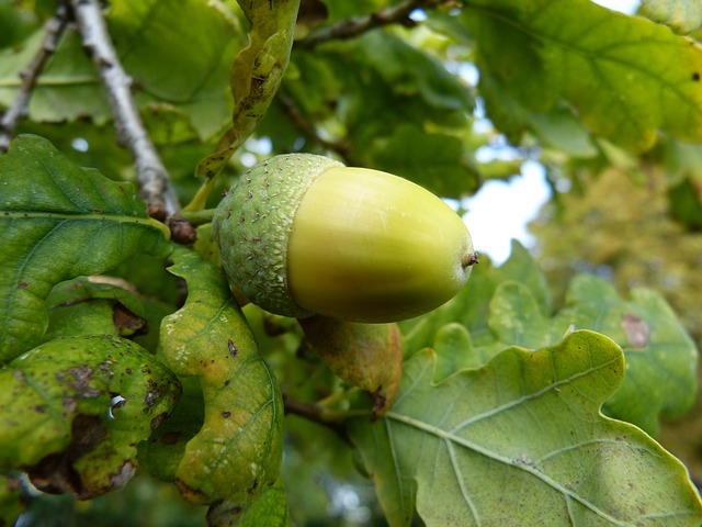 Oak is easy to recognise by its bark which is rugged and deeply fissured in older trees. The leaves have characteristic rounded lobes and the fruit are acorns which begin green and turn brown before falling in the autumn.