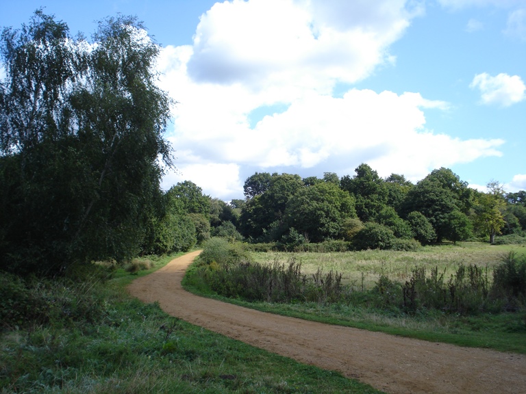 Cross Palmer’s Bridge and immediately afterwards fork right on a path. This path runs in a very straight line and is known as Red Path (because it was originally made with crushed red brick rubble). After about 500 metres Red Path meets a bend in another path, turn right then immediately left onto the wooden boardwalk over a pond called Connaught Water.
