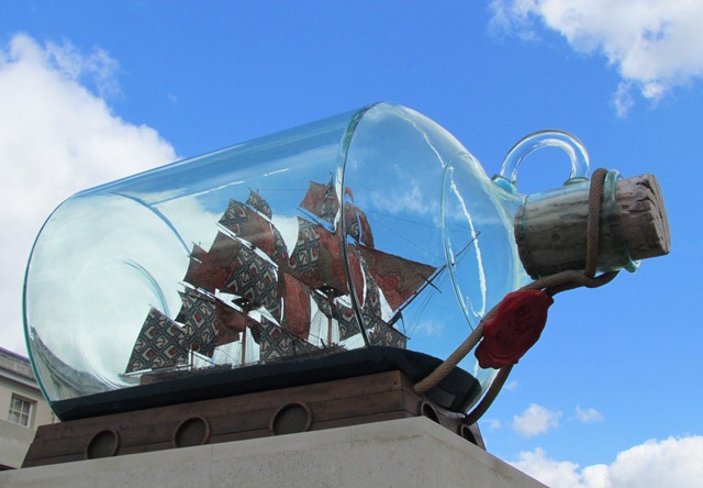 Beside the entrance is a public artwork called ‘Nelson’s Ship in a Bottle’. It was made by BritishNigerian artist Yinka Shonibare and it used to stand on the fourth plinth of Trafalgar Square. The ship inside is a model of HMS Victory, the ship Nelson died on at Trafalgar. The colourful sails feature Indonesian ‘batik’ designs. Textiles like these were made in the Netherlands and traded in West Africa by British merchants. The work therefore explores the international legacy of Britain’s maritime empire.
