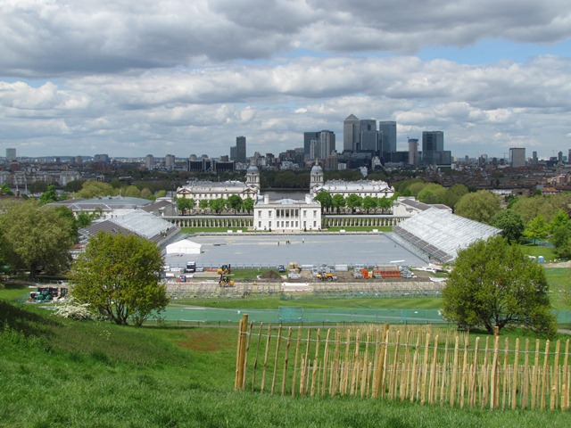 For most of 2012 the foreground of the view was transformed. During the Olympic Games, an arena was built behind the Queen’s House for the equestrian and pentathlon events. The pentathlon was designed by Baron Pierre de Courbertin, the French founder of the modern Olympics, to simulate the experience of a cavalry soldier. The competitions are horse riding, shooting, sword fencing, swimming and running.