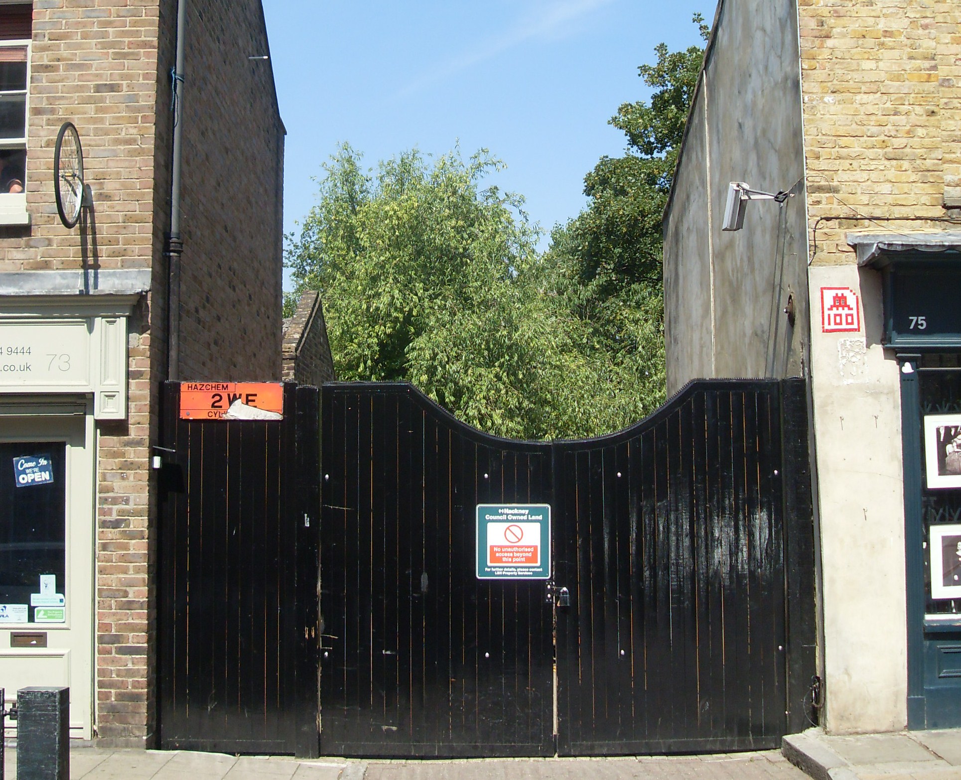 The Cat and Mutton pub has stood on this site for centuries. Let's look on the opposite side of the street though. Between number 73 and number 75 is a black gate.