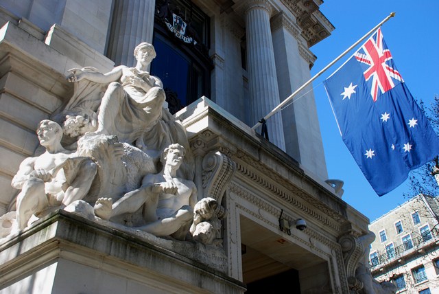 With your back to the church entrance, cross over the two pelican crossings ahead and stop outside Australia House.