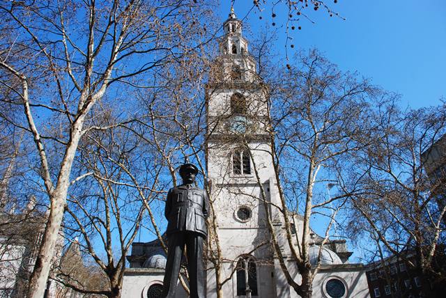 The other two statues relate to St Clement Danes being the Central Church of the Royal Air Force. Lord Hugh Dowding was Air Chief Marshal during the Second World War. He was largely responsible for winning the Battle of Britain and therefore securing the survival of Great Britain. Sir Arthur Travers Harris meanwhile was Commander–in-Chief of Bomber Command and is controversially credited with speeding the end of the war.