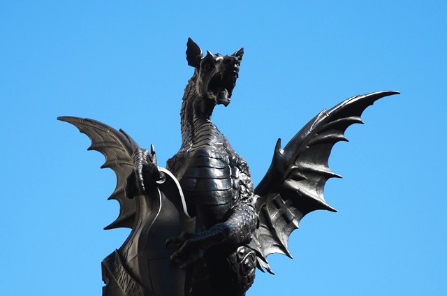 We are now at the entrance to the City of London. This point where Fleet Street becomes The Strand marks the western limit of the City. Previously a stone gateway stood here designed by Christopher Wren, but as traffic grew it became an obstacle. In 1878 it was replaced with the current memorial designed by Sir Horace Jones. The winged dragon on the top is the symbol of the City of London. This is derived from the figure of Saint George in conflict with the dragon.