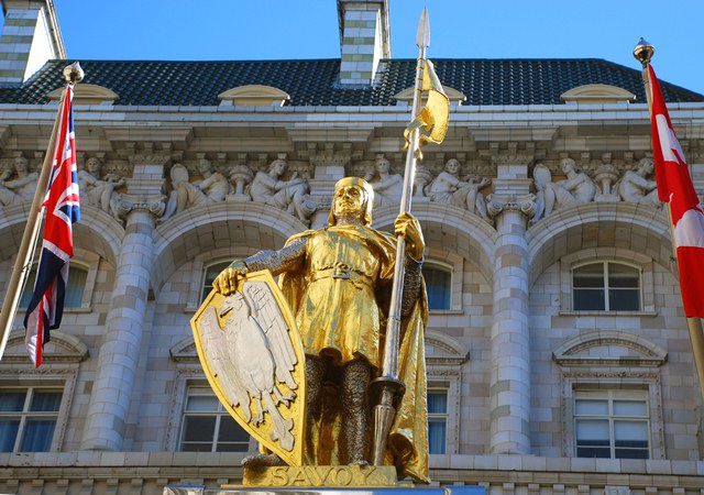 The family of Savoy were from an area now on the borders of modern day France and Italy. The gold statue you can see on top of the hotel façade is of Count Peter II. Count Peter’s niece, Eleanor of Provence, was the queen-consort of Henry III of England. King Henry III made Peter the Earl of Richmond and, in 1246, gave him the land between the Strand and the Thames. Peter built the Savoy Palace here in 1263.