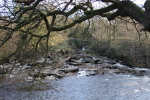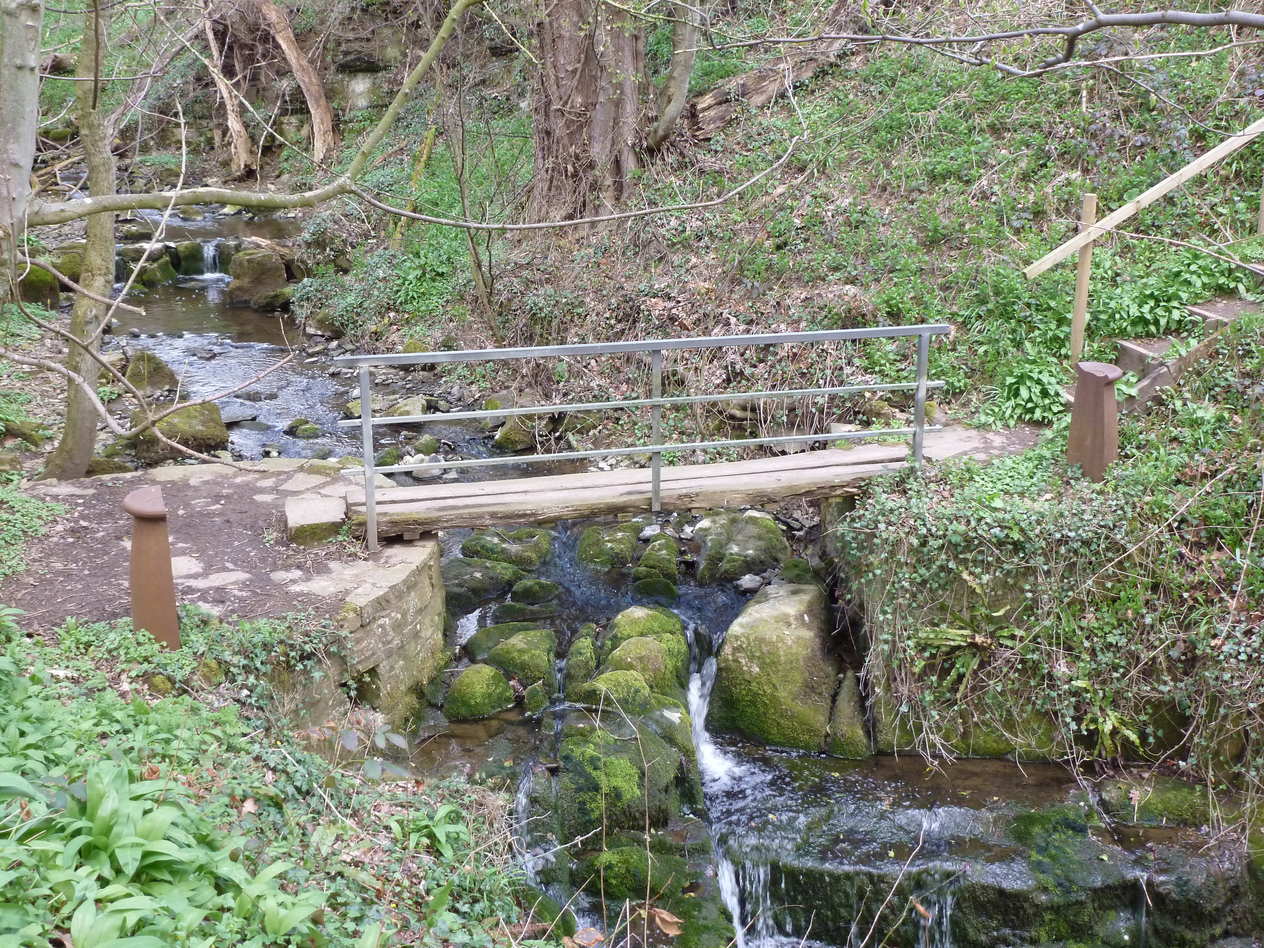 Proceed and go through a wooden gate in a fence, keeping to the right-hand edge of the field. Continue through two more fields, with wooden hand-gates, until a gap in a stone wall leads down some steps to a wooden footbridge, crossing a small stream.