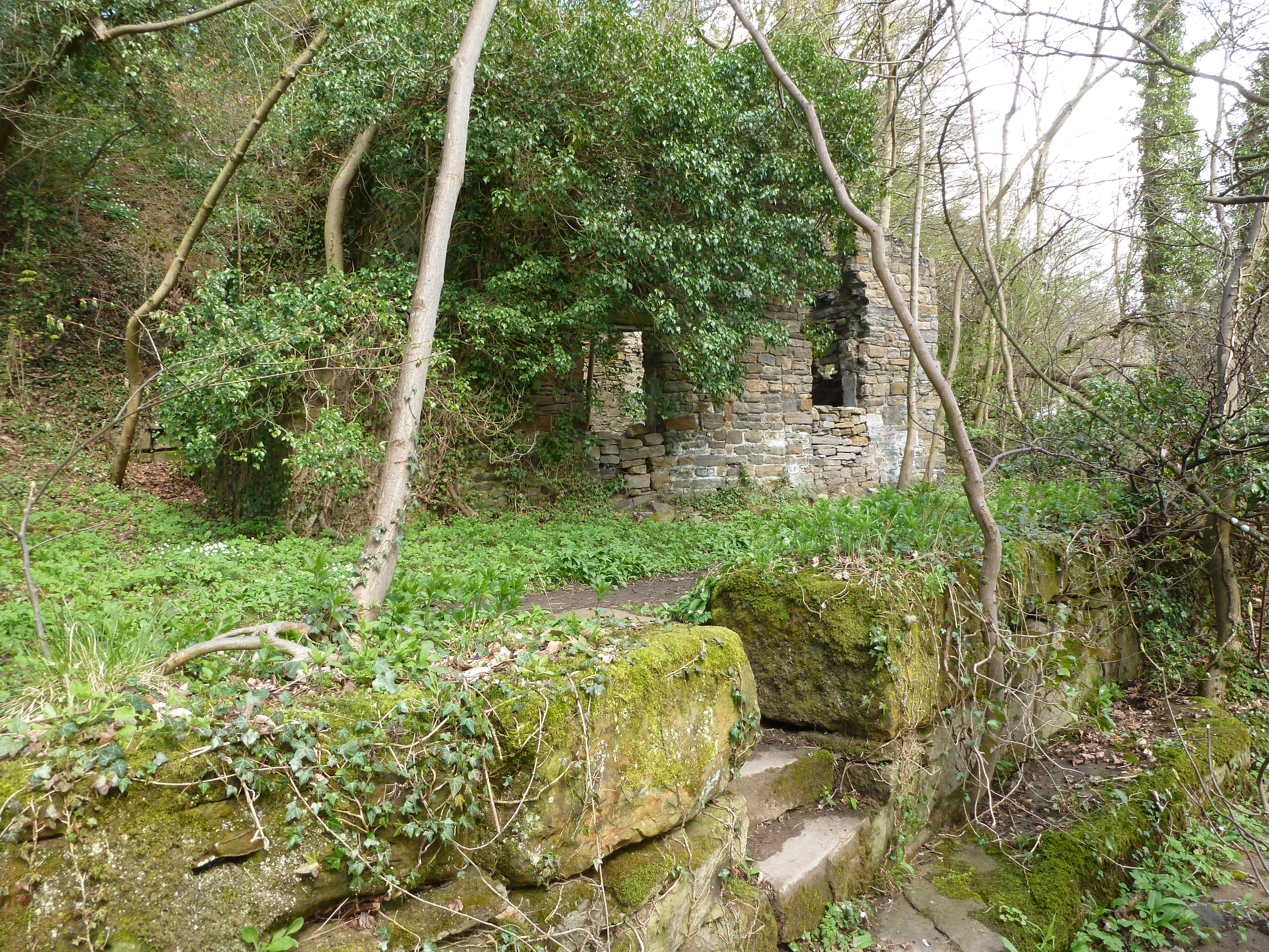 Continue uphill to the end of the metal barrier and turn right at the footpath signpost marked “Teesdale Way”. The path soon descends through a wood to stepping stones across Whorlton Beck. Once across the beck, follow the banks of the river and up some stone-steps to a ruined house.