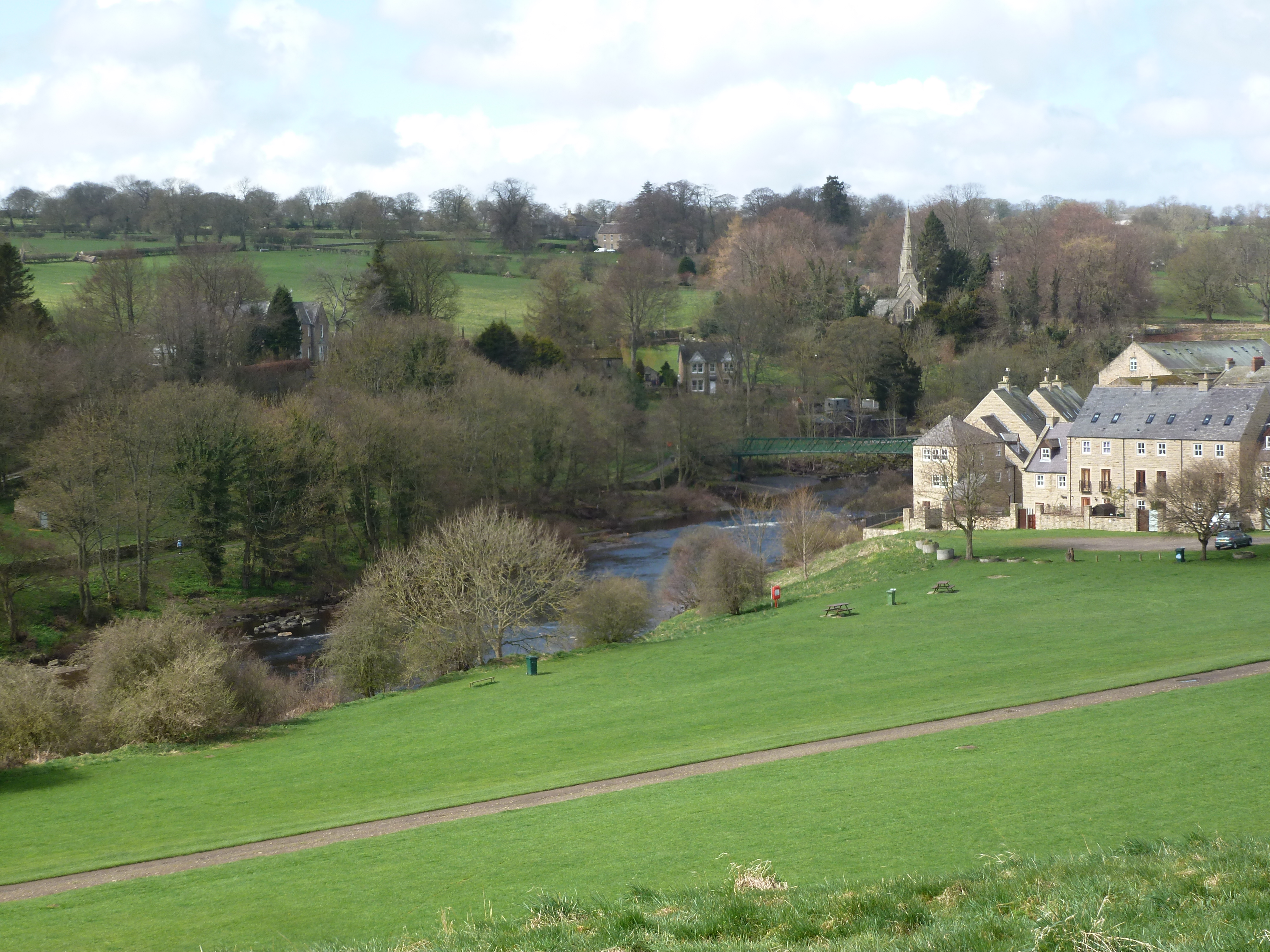 From outside the door of the church, pass into the graveyard. In the far bottom corner, follow the green public footpath sign down the hill into a wide grassy area. Turn left under a barrier, with a footpath sign for “Teesdale Way-Abbey Bridge” and then cross to the river bank on your right, where there are picnic tables.