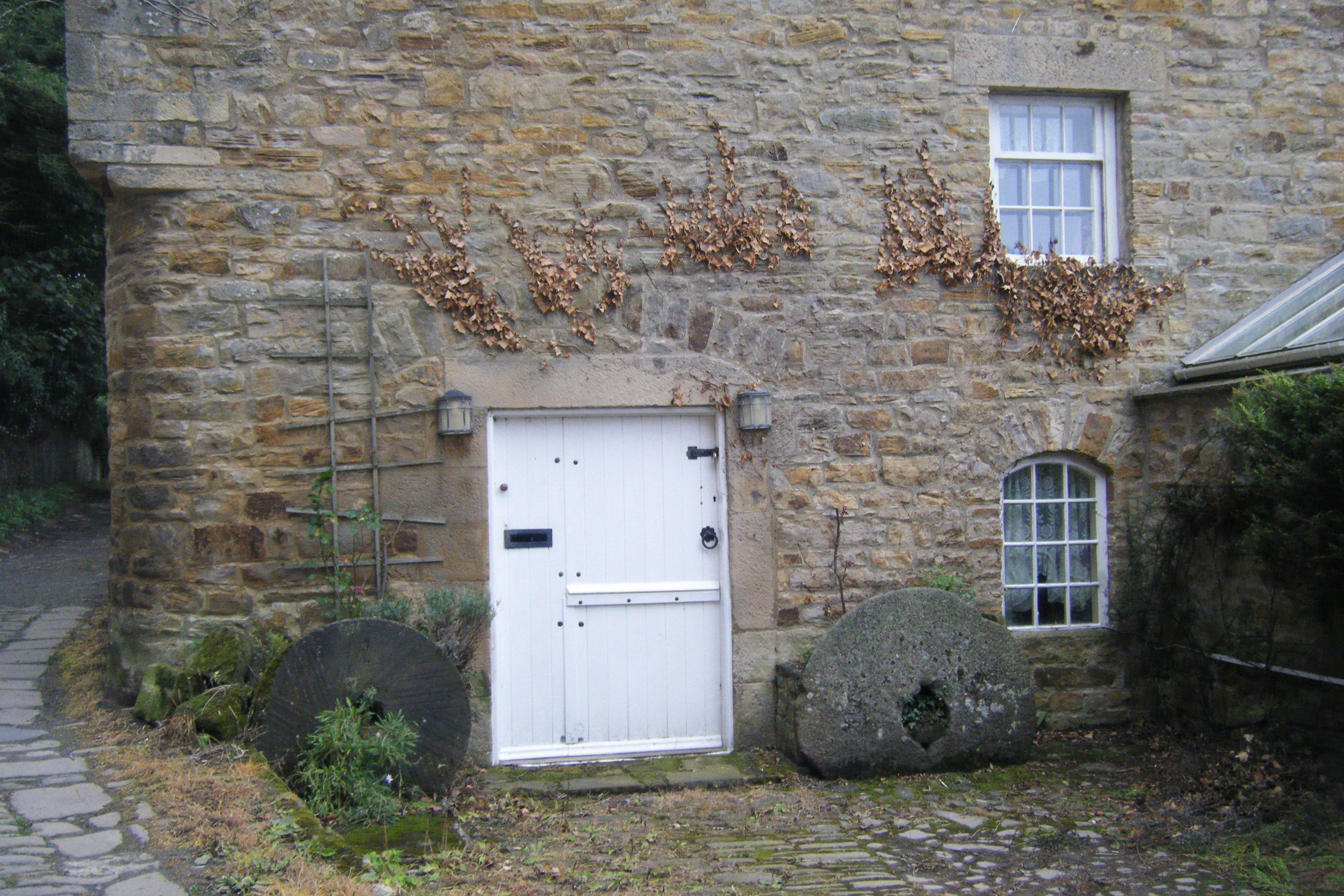 As we pass the old miller’s house, look out for the two millstones on either side of the front door. You can also still see the paved cart track, with its central cobbles for grip and outer flagstones for the smooth running of cart-wheels. As you pass the next house, look up to see the first floor window which would have been a loading door for winching up sacks of grain. Imagine the sounds of carts rumbling over these stones, the clipping of horses’ hooves and the shouts of men heaving sheaves of corn and bags of flour.