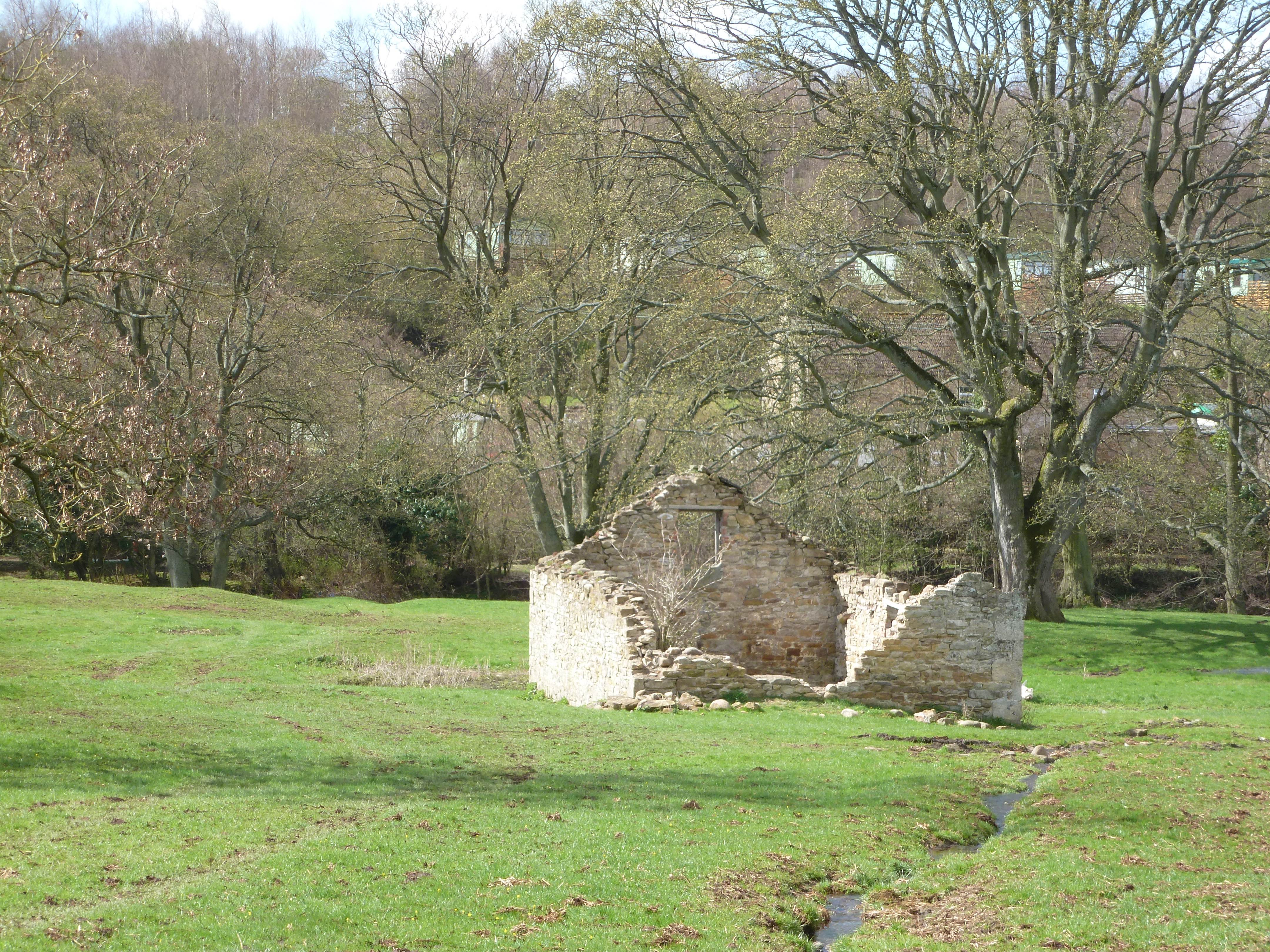 Ignore the dramatic ruins on the skyline for now (we’ll come to those later) and instead look across to the opposite bank of the river and left to see a group of stone buildings. In front of these buildings you should be able to see a wall with two window openings. You may also be able to see some slabs of rock slanting down into the river just beyond. The wall is all that remains of the Egglestone Abbey Mill. This was a paper mill producing hand-made white paper as early as 1717.