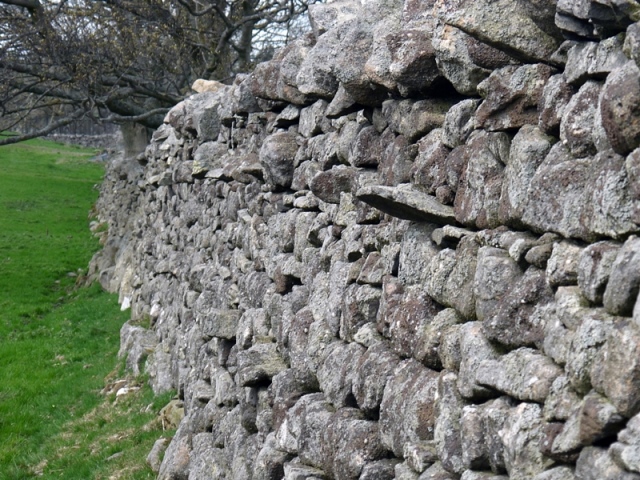 Some walls use rounded boulders, which would have been smoothed by the action of glaciers and rivers and cleared from the fields for agriculture. Mostly, however, these walls are built from stone that would have been taken from small quarries (still visible at the bottom of the stream down to your right) and then cut and shaped to fit the wall.