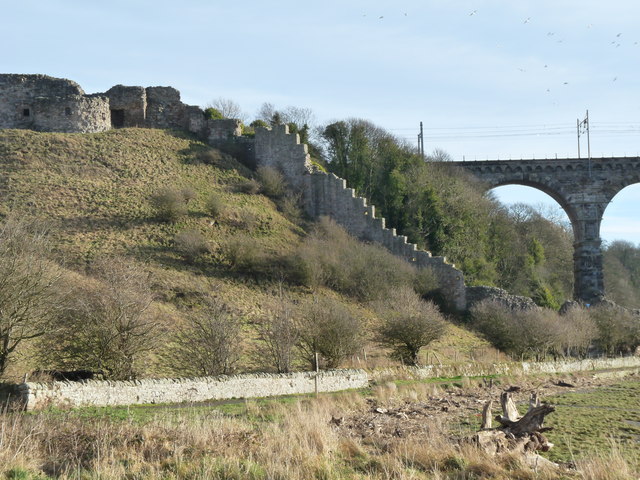 From the station entrance turn left with the train tracks on your left and the car park on your right. Go up the steps and turn left to cross the bridge over the railway. Where the main road forks look for a signed footpath on the left side. Go through the gate and follow the path as it snakes downhill. Go through the next gate. Stop at the curved bench overlooking the river, viaduct and castle walls.