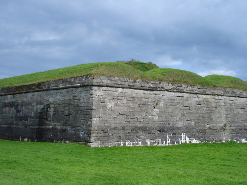 Go through Cow Port then through the gate on the right and up the slope onto the ramparts. Where you meet the main path turn left with the church on your left hand side. At the corner you may wish to go up onto Brass Bastion on the right. Turn left and follow the path along the ramparts. Stop at the next mound.