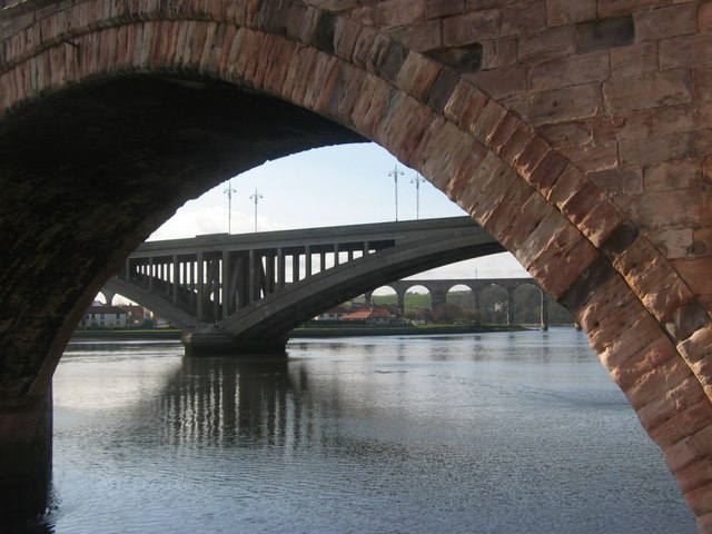 Retrace your steps down from the viewpoint. Turn right along the path and down to the gate. Continue straight along the lane and follow it as it bends round to the left. Where the lane splits take the right pedestrian fork. Follow this path down the slope and under the road bridge. Follow the signs for Coast Path which take you along Bridge Terrace. Stop at a convenient place between the Royal Border bridge and Royal Tweed bridge.