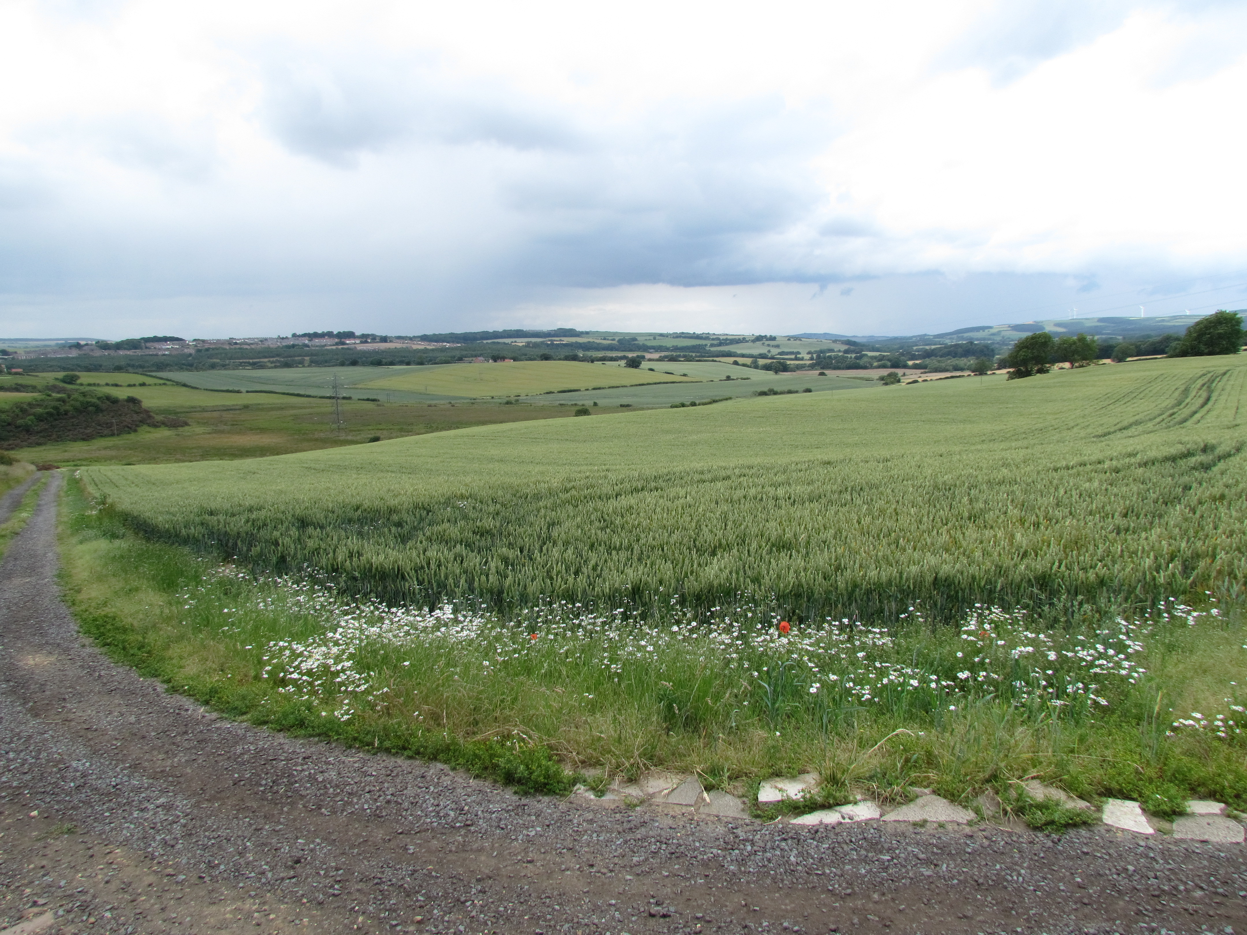 At the highest point, where the electricity pylons on the left hand side come closest to the track, you are standing above the narrow valley of the Browney. Depending on the state of the vegetation it may be possible to see the river from here; but we are about to leave its valley and return to Durham.