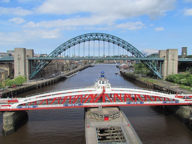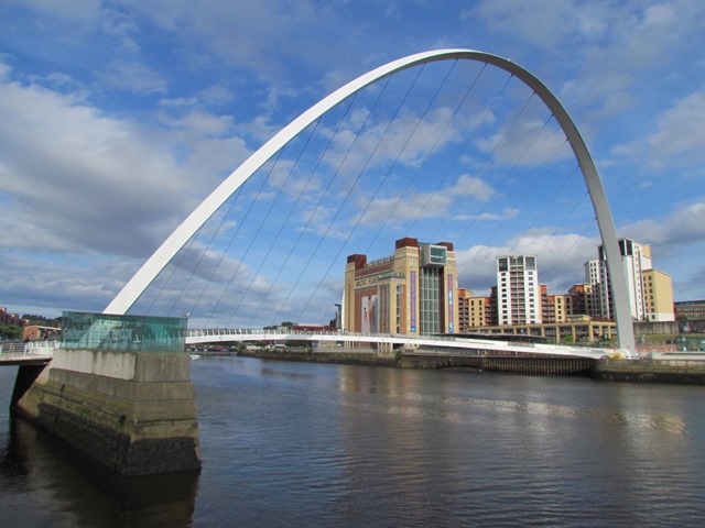 This striking structure is the Gateshead Millennium Bridge. Gateshead is a town on the opposite bank of the Tyne from Newcastle. Gateshead Millennium Bridge and the Sage concert venue we just passed are landmarks of the recent regeneration of Tyneside.