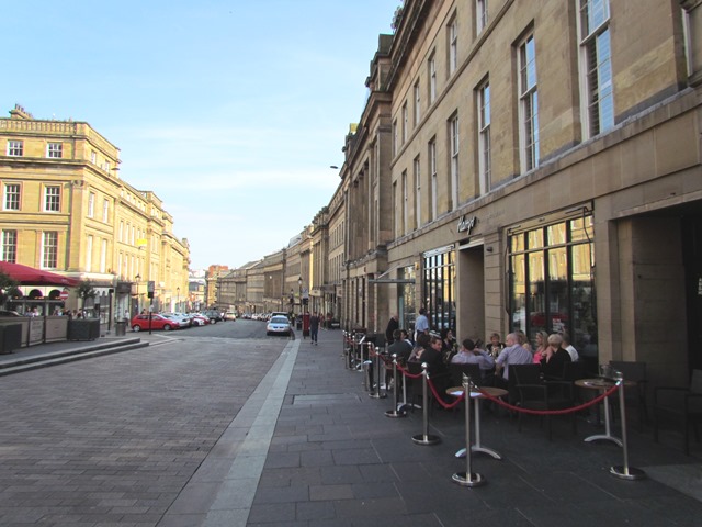 With your back to Grey’s Monument continue down the right hand side of Grey Street (the pedestrianised road the statue is looking along). Cross over Market Street and immediately stop with the Theatre Royal across the road on your left. Look down the length of Grey Street as it curves downhill.