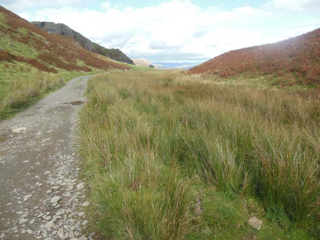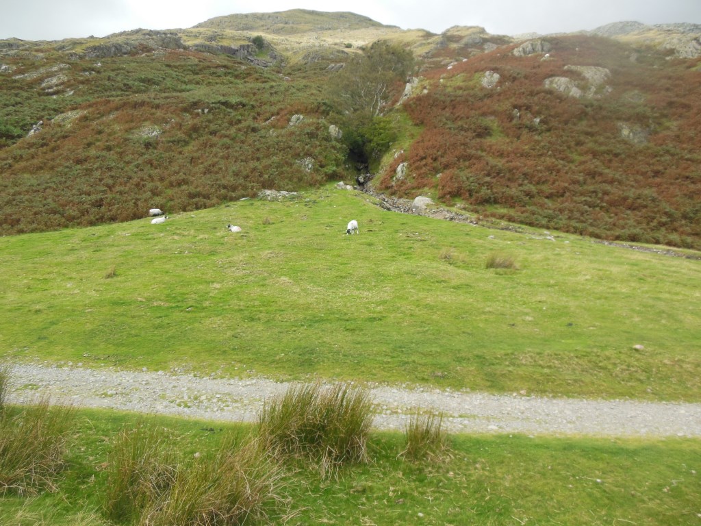 Leave the quarry car park heading southwest along a gravelled track signed ‘Walna Scar Road’ which passes to the south of the Old Man. The path bends slowly then more sharply to the right before bending at a right angle to the left. Stop here just before the track is briefly tarmacked.