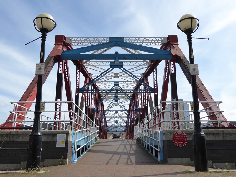 Did you spot a round plaque by the steps? If not, notice how wide the bridge is, despite only pedestrians and cyclists being able to access it. This was originally a twin-track railway bridge. It spanned the Ship Canal so freight trains could run between Manchester Docks and Trafford Park.