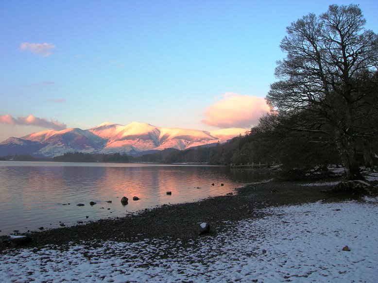 The highest mountain in the picture (and in the actual view) is Skiddaw at the northern end of Derwent Water. Notice the gap in the mountains where the River Derwent flows into Bassenthwaite Lake beyond and then on to meet the sea.