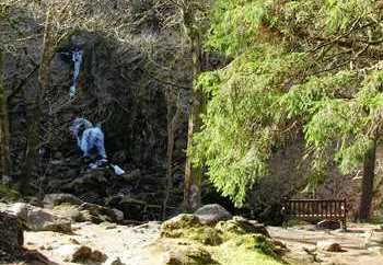 On the other side of the footpath, almost level with the top of the waterfall, you might be able to see the natural cliff face covered in foliage. This formed the back of a mock hermitage.