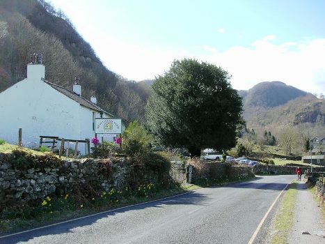Retrace your steps towards the foot of the falls and cross the small metal footbridge at the back of the Lodore Falls Hotel. Follow the service road around the back of the hotel to meet the main Borrowdale Road. Cross the road with care and then turn left to walk along the narrow roadside footpath with a public toilet block on your right and the road on your left. Follow the roadside footpath for about ¼ mile until you are level with High Lodore Farm.