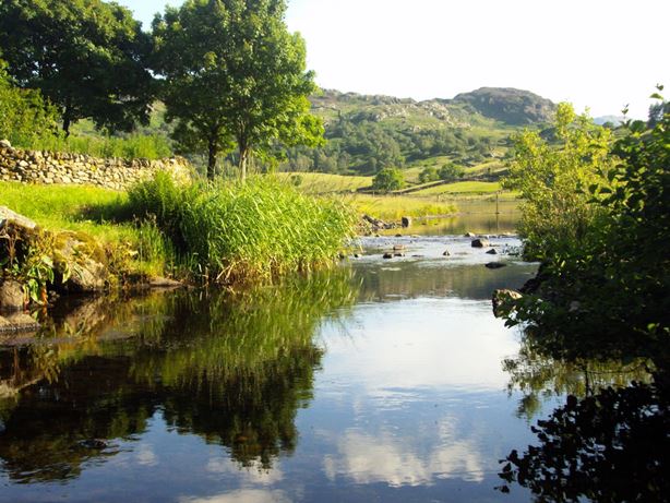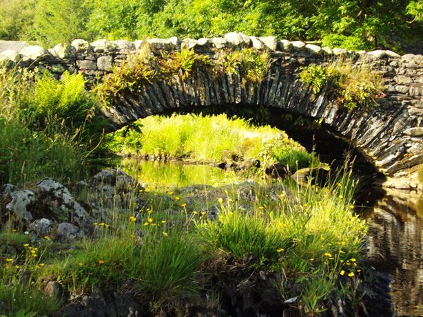 Walk down the right side of Fold Head Farm to the edge of Watendlath Tarn. Turn right along the track, following it round to the stone bridge. Stand on the bridge.