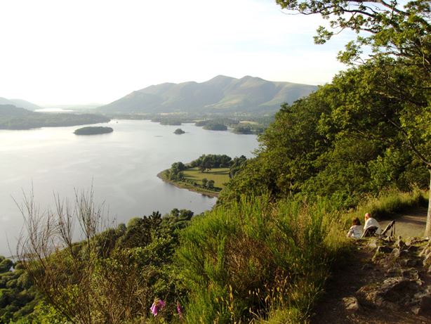 As you round the peninsula you will be able to see the southern end of Derwent Water with wooded crags to the left and sweeping fells to the right. Hopefully, if there has been enough rain, you will be able to glimpse the Lodore Falls amongst the trees – the waterfall appears to drop into the back of a large grey hotel.