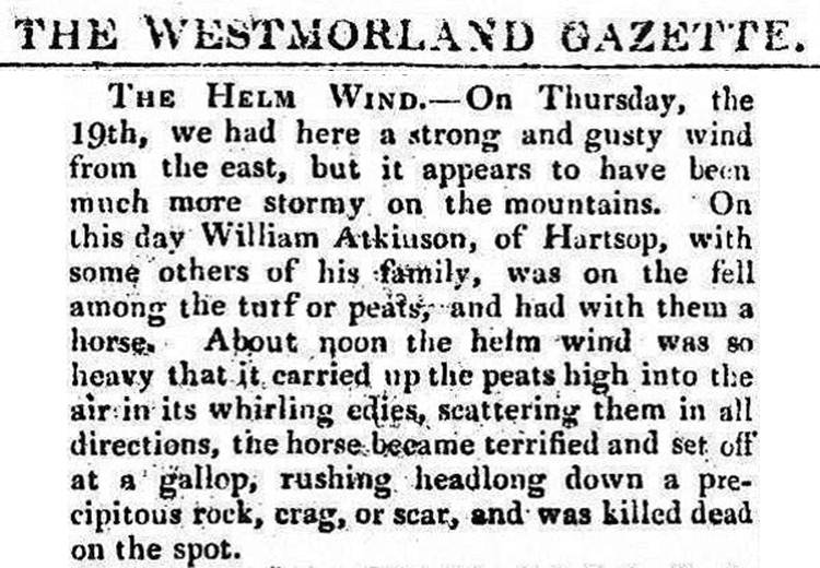 About noon the helm wind so so heavy that it carried up the peats high into the air in its whirling eddies, scattering them in all directions, the horse became terrified and set off at a gallop, rushing headllong down a precipitous rock, crag, or scar, and was killed dead on the spot."