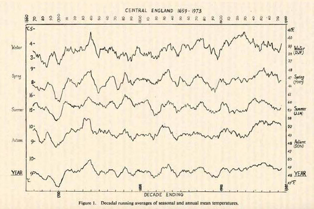 Manley first published his ‘Central England Temperature’ series in 1953 (covering the period 1698 to 1952), and updated and extended it in 1974 to cover 1659 to 1973.
