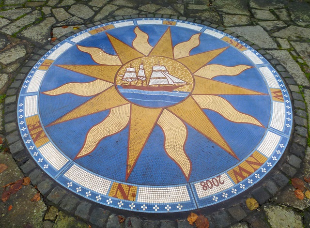 Follow Jubilee Cresecent as it curves to the left. Pass the stone balustrade and turn left up the shallow group of steps. To avoid the steps cross the grass. Stop by the circular mosiac in the ground showing a ship.