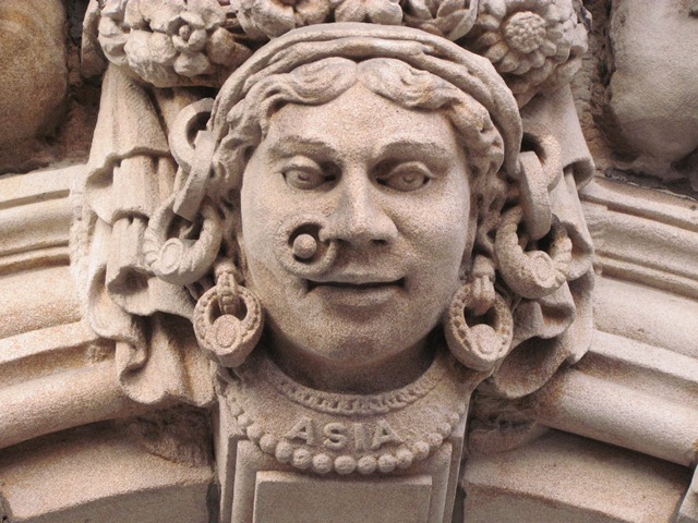 To begin, look above the first row of windows for a series of stylised heads. They represent countries from the British colonies - including India, Canada and Sudan.