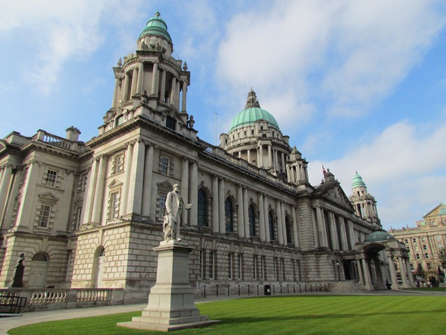 Take your time to look at the wealth of detail on the Scottish Provident Building. Feel free to cross over the road for a closer look. When you are ready enter the grounds of Belfast City Hall. Stop when you have a good view of the front of the building.
