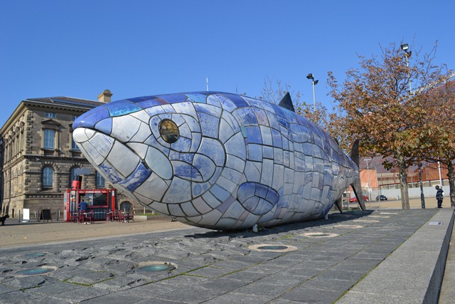 Follow Donegall Quay round to the right. Continue underneath the bridge and then turn onto the riverside path. Keep the river on your left and continue until you reach a large fish sculpture.
